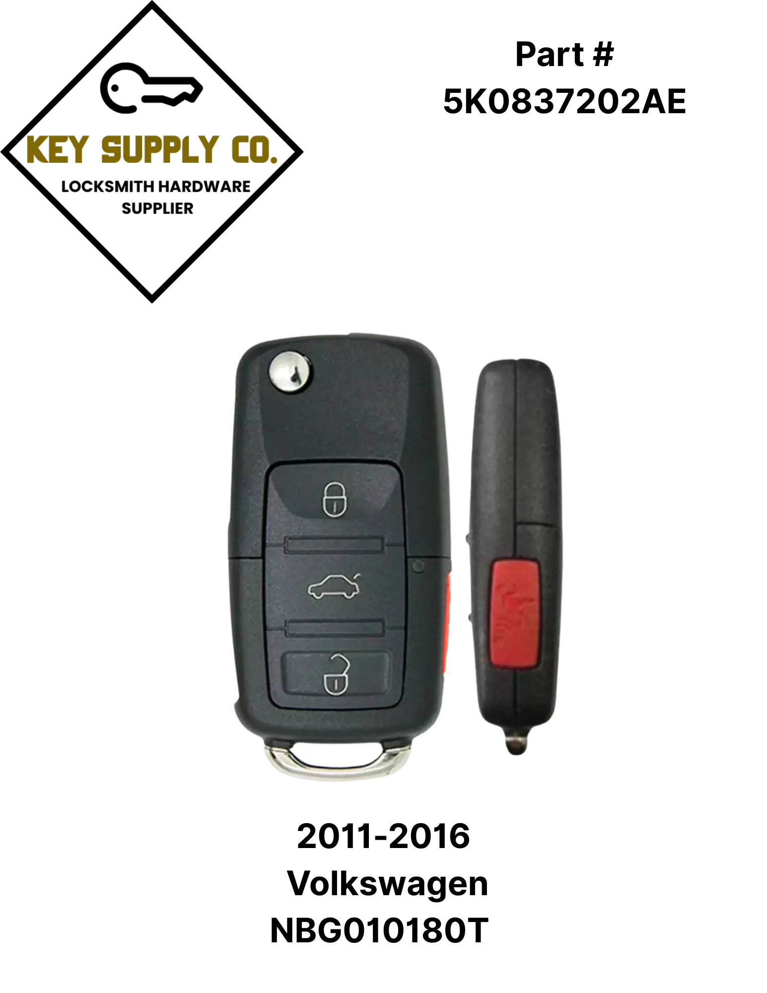 2011-2016 Volkswagen / 4-Button Remote Flip Key / 5K0837202AE / NBG010180T / 315 MHz (AFTERMARKET)