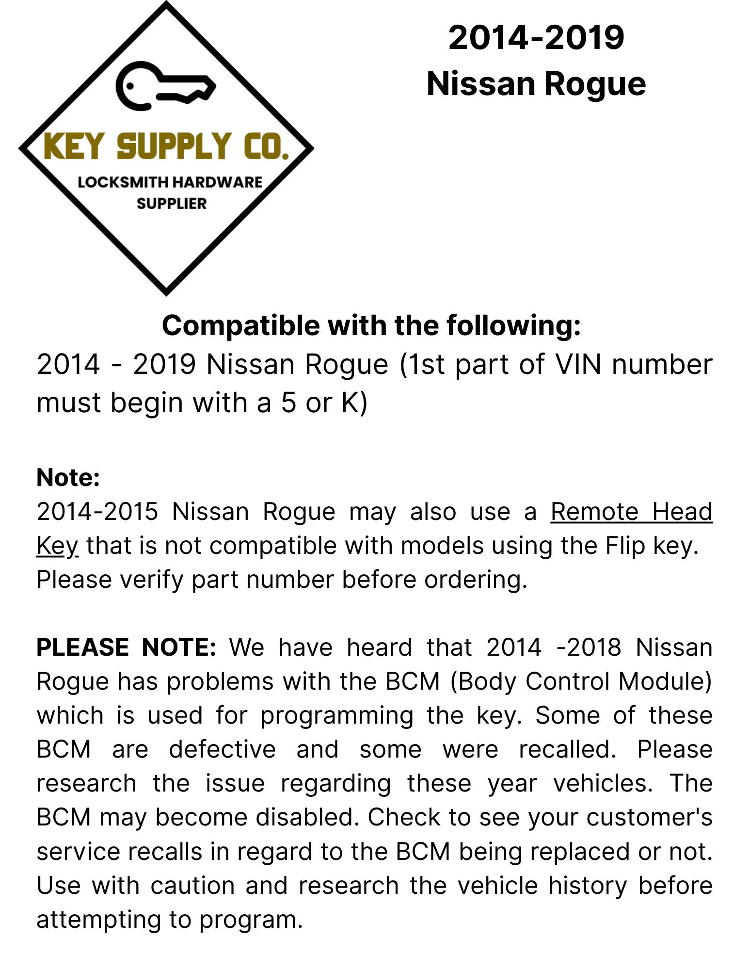 2014-2015 Nissan Rogue may also use a Remote Head Key that is not compatible with models using the Flip key.