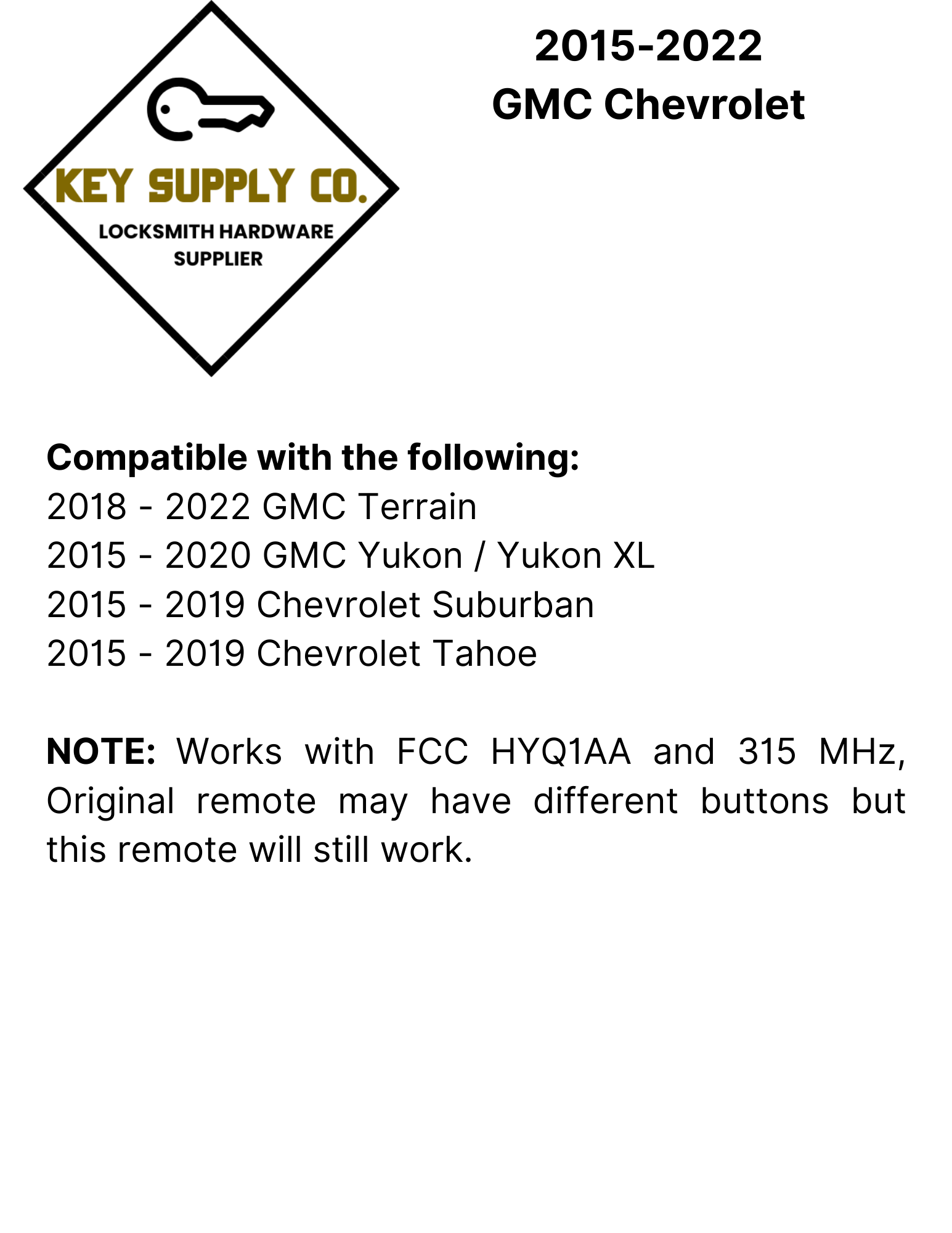 NOTE: Works with FCC HYQ1AA and 315 MHz, Original remote may have different buttons but this remote will still work.