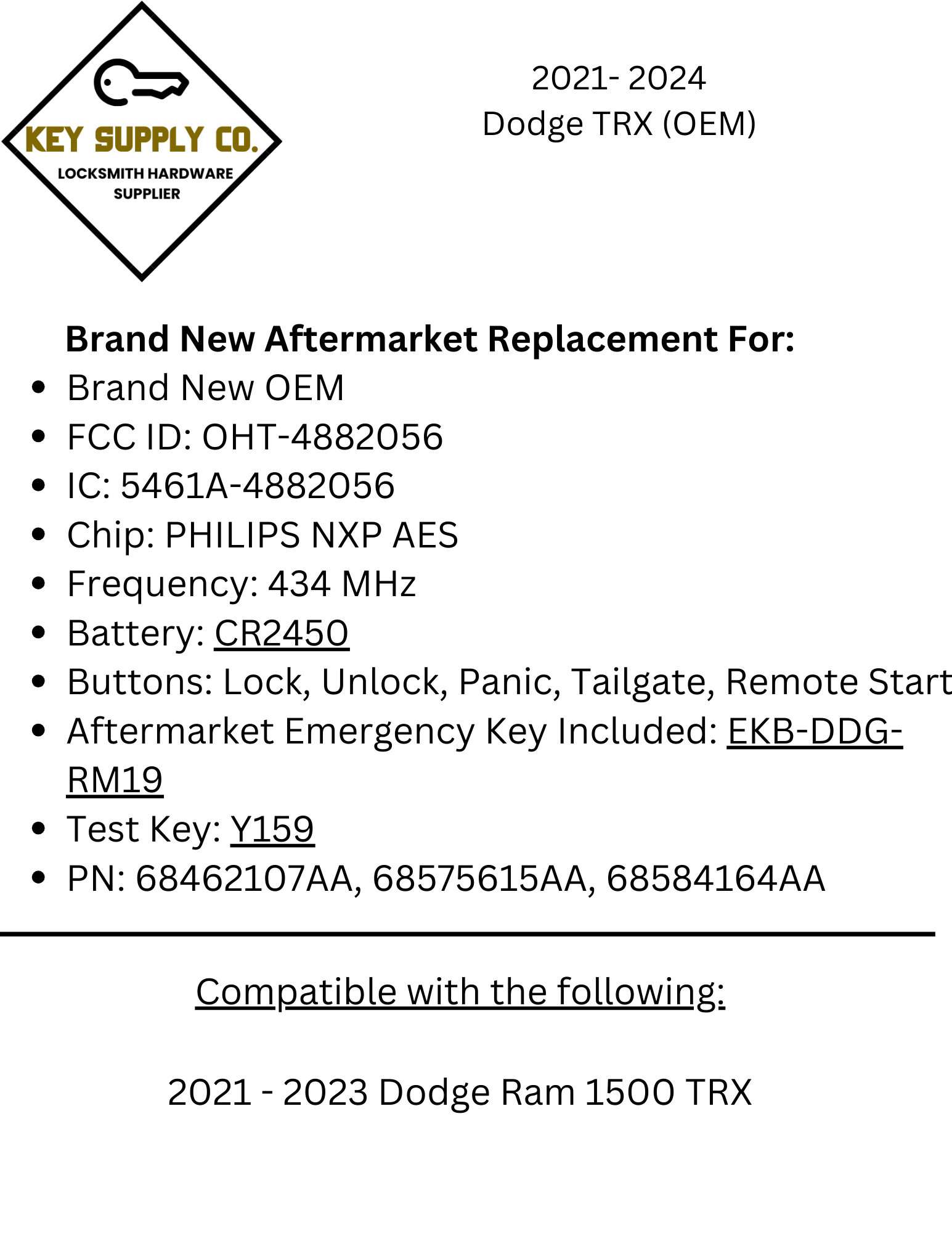 - Aftermarket Emergency Key Included: EKB-DDG-RM19