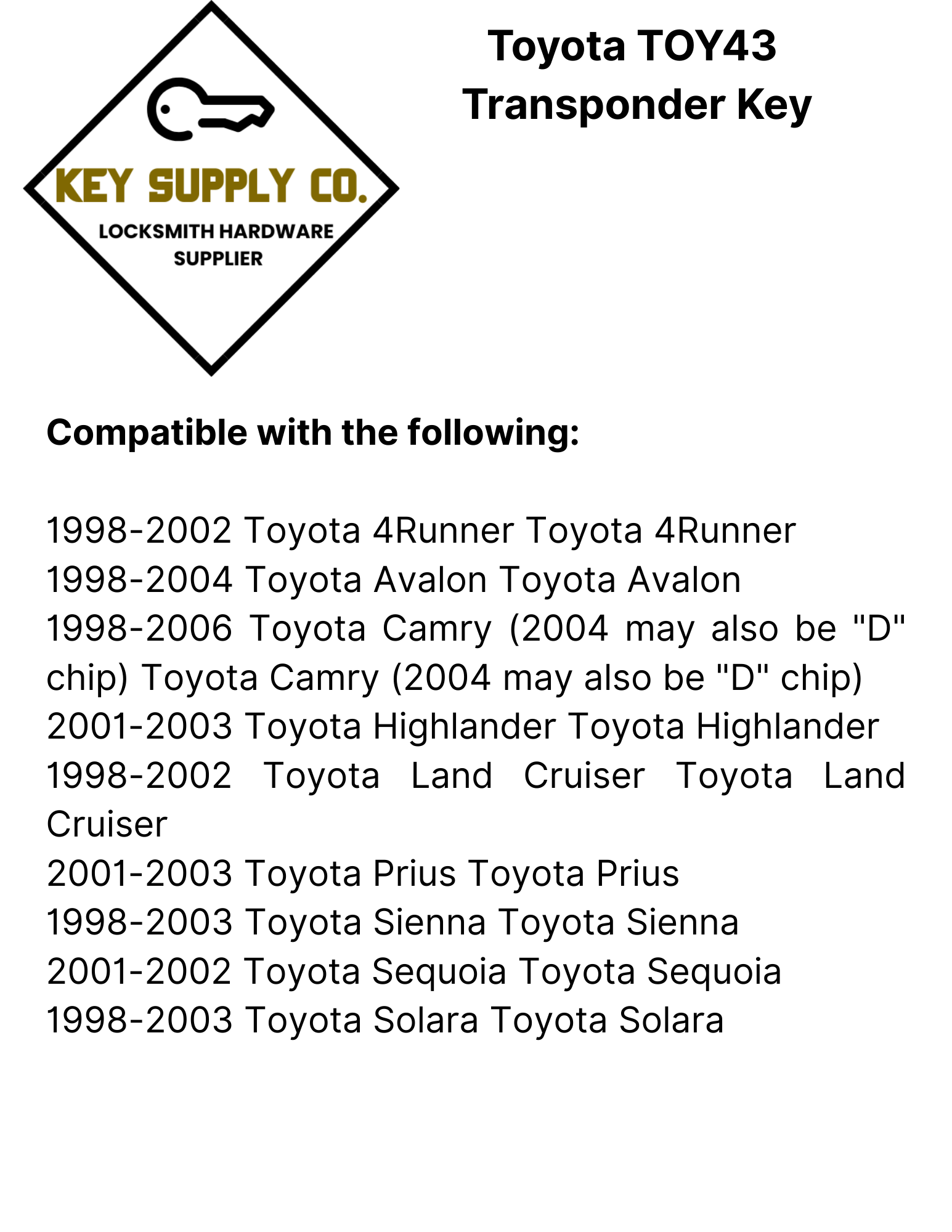 Toyota TOY43 Transponder Key (4C Chip) (AFTERMARKET)